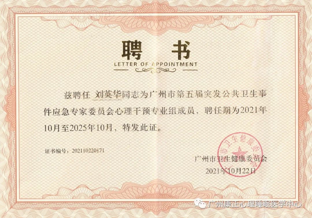 近日,我中心劉英華主任獲聘廣州市第五屆突發公共衛生事件應急專家委員會心理干預專家組成員。