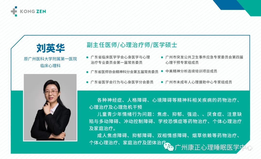 劉英華主任,原廣州醫科大學附屬第一醫院臨床心理科副主任醫師,心理治療師,醫學碩士研究生,高校基礎心理學教師,廣州市未成年人心理援助中心專家,中美精神分析連續培訓項目成員,廣東省臨床醫學學會心身醫學與心理治療專業委員會第一屆常務委員,廣東省控制吸煙協會第三屆理事會副會長。
