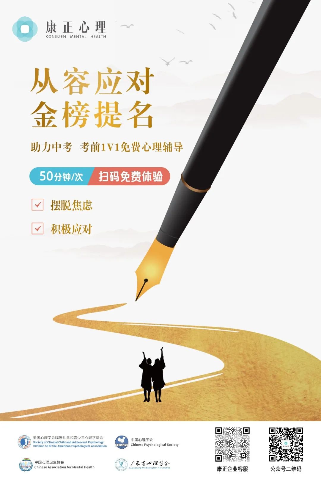 廣州康正心理學研究中心,為廣大即將面臨中考的學生免費提供一對一心理輔導,幫助考生緩解考前焦慮,從容應對考試。